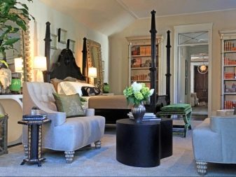 And in order to emphasize the interior in design objects, a little dark or catchy color is usedfor example, it can be mirrors of small sizes, framed in a chic wide frame in gold colors or a dark heavy carved frame made of wood, a floor lamp on a carved leg made of dark wood.