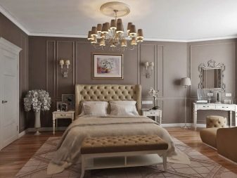 Neoclassic is for connoisseurs of tradition, not tolerating excessive flatulence. This style fits perfectly into a room of any size due to its consistency. In this example of a modern neoclassical bedroom interior, the secretary and an elegant natural wood dressing table with a high chair look great, small pillows will add coziness.