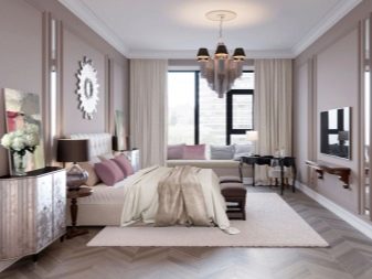 Usually a bedroom decorated in neoclassical style is a room in pastel, neutral colors.. Against the light finish of all surfaces, dark wood furniture looks very comfortable. Chocolate tones, a shade of wenge, may have a continuation in the design of floor coverings, but basically the bed is arranged on a carpet of light tones.