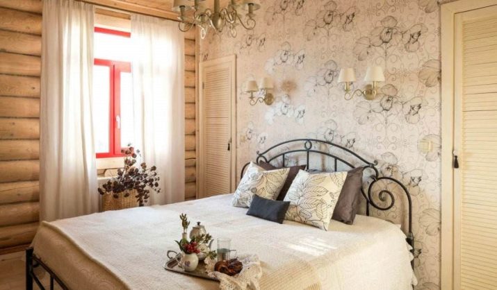 Features of the country style is that it is universal. Any texture and any color here will be correct and appropriate. Designers usually recommend wallpapering with a floral print or a national ornament in a rustic bedroom. In this case, it is desirable to use a light color scheme.