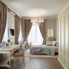 - The classic version. This option involves the separation of the table and bed. The main thing is that the overall style is not lost, products are competently combined. Alternatively, a table can be placed at the foot of the bed or at the head of the bed. Thus, you can save a significant part of the space of the room, and also organize a new zone.
