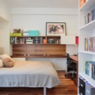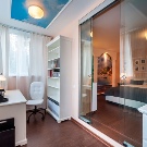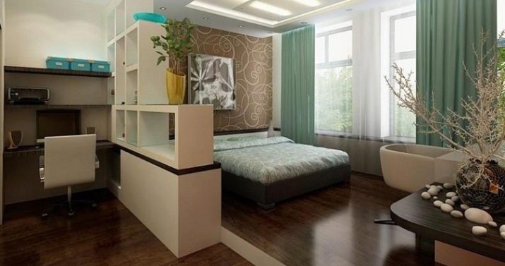 - If you need complete privacy, then you can separate the bed from the table using the rack. In the rack you can put books or folders with documents. It motivates well for productive work. The color scheme for the entire space can be chosen the same, but can be divided: for the bedroom - muted, delicate colors, the work area should be designed brightly so that the mood for work is.