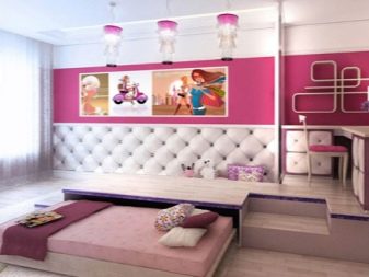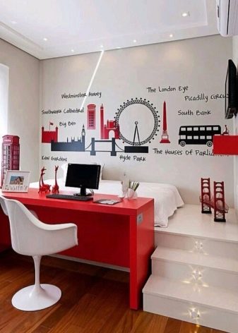 - Using the podium, you can optimally fit the workplace into the bedroom. The podium space can be functionally used. For example, to store things, documents or create another berth. The best option is an exit bed.
