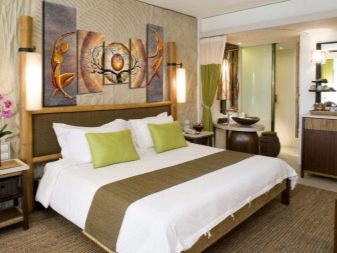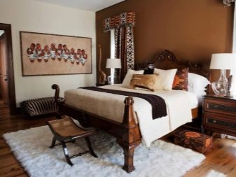Bedroom color palette ethno style very calm and nice looking. Primary colors range from sand to chocolate brown. The bed with a leather headboard is decorated with a bedspread and decorative pillows with an unusual pattern. Right above the headboard is an unusual woven decorative element, as well as two classic sconces. On small tables - red candles in candlesticks.