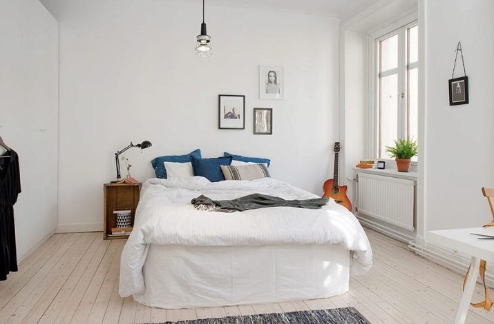 Very stylish and budget bedroom in scandinavian style obtained with minimal use of furniture and accessories. The decoration in the room is very simple - a light laminate on the floor, as well as white paint on the walls.