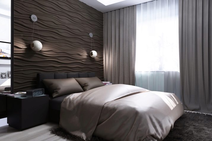 The installation of 3D panels will add a futuristic look to the bedroom. They fill the space, attracting glances. And also this type of finish is able to hide defects in the rough finish.