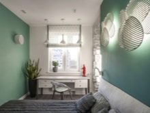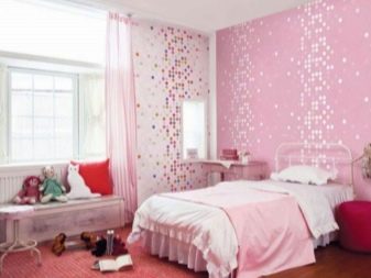 A little girlish, but light room is obtained using pink shades. Thanks to the placement of the mirror opposite the window, it turned out to add a room of extra square meters. The walls are not overloaded with patterns, since the wallpaper covers only one wall. The necessary zoning of the space provides a multifunctional rack.