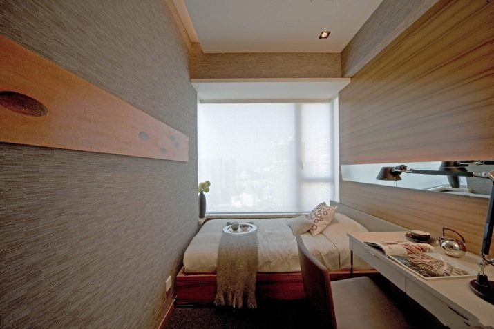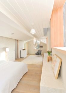 Sometimes a narrow bedroom appears in a one-story village house, when, in order to allocate a place for sleeping, a part of the attic or utility room is reissued.