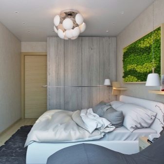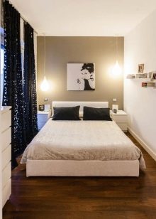Valuable square meters are saved by replacing a large cabinet with several long shelves located directly above the bed. A drawing is also applied to the opposite wall, also visually expanding the room, creating the effect of moving into the distance. The white ceiling with a laconic chandelier does not steal extra meters. Light walls, textiles and most of the accessories create a relaxed, pleasant atmosphere. A pair of nightstands and a simple carpet are needed as a balance of dark objects.