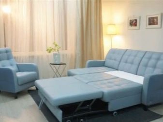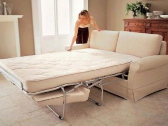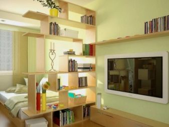 It will create a free passage, not interfere with the use of the room throughout the day, and at night perform the required function. It is recommended to install the cabinet near a narrow wall, as well as consider the possibility of replacing a massive object with hanging shelves.