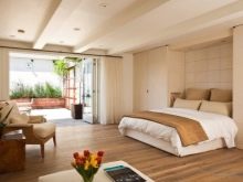 A vivid accent of the present can be photo wallpaper, which will contrast with the general appearance of the room.