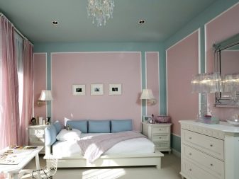 - Paint. A difficult but budget option for wall decoration, which has a lot of advantages. This method of coloring allows you to adjust the geometry of the sleeping space and visually complement the interior. Thanks to the use of different shades of paint, it will be possible to zone the room, combining it with other decor options.