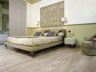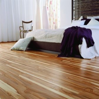 - Parquet. Thanks to the naturalness of the material, a feeling of warmth, comfort and coziness of the sleeping space is created. A variety of parquet allows you to satisfy the most daring requirements of man.