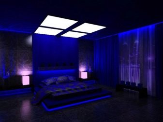 The LED strip also looks interesting in such designs, it is usually placed above the head of the head or built into wall niches and ceilings. If you place the light source under the bed, you will get the feeling that it easily soars in the air.Similar options are usually used in dark interiors, which need to be slightly filled with romance. Additionally, you can put original candles (on LEDs) in the room.