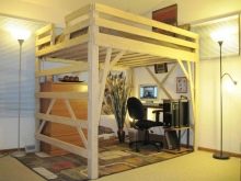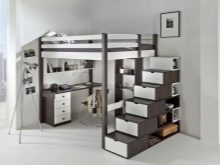 - A very specific look has a double loft bed. The essence of this unit is that the sleeping place is on the upper tier, while below it, on the lower tier, there is a space that the owners of the bed can furnish as they wish. You can create a recreation area from this space or, conversely, a site for work. A section with a ladder is included in the walls of the tiers to climb to the upper level.