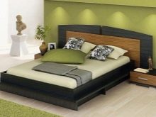 - A bed for two in the style of minimalism implies a clear rectangular frame and a low back. The foot of these models is either absent altogether or does not rise above the level of a berth. The frame of such a bed is made mainly of chipboard or MDF and has neutral colors. Sometimes the whole frame is covered with plain eco-leather upholstery. The headboard often goes into bedside tables, forming a single line.