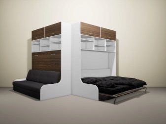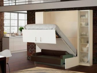 - The most ergonomic are models of the type "transformer", allowing you to convert a double bed into a table or wardrobe. The lifting mechanism of such products can be both vertical and horizontal. It also has special locks so that the bed takes a secure position when assembled.