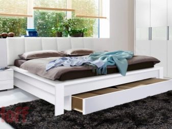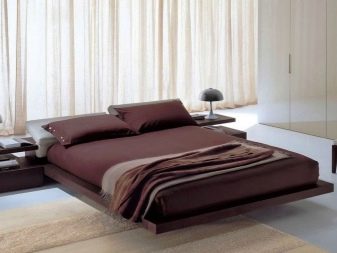 Sometimes the beds for two are located on the podium, equipped with lighting, and sometimes they are attached with the entire front part along with the headboard to the wall, leaving the back part as if soaring in the air.
