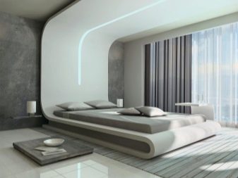 - Hi-tech style opens up the greatest scope for imagination when choosing a double bed. It is this style, aimed at innovation, that allows you to choose furniture of an unusual shape, for example round, with truncated corners or a concave headboard. In this concept, glossy textures and strict colors are acceptable on the bed - white, gray, black, brown.
