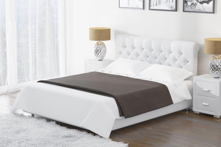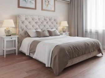 - A carriage screed on the bed upholstery changes its style and gives this piece of furniture an additional charm. This is especially pronounced due to the fact that the upholstery has a light shade.