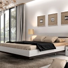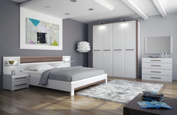- Strict and concise set, designed in white and gray tones, will be a good solution for the bedroom in a modern style. It can be placed surrounded by pale gray walls, a white multi-level ceiling and a light floor trimmed with delicate caramel laminate. To dilute discreet colors is a large abstract picture above the headboard, decorative vases and lamps.