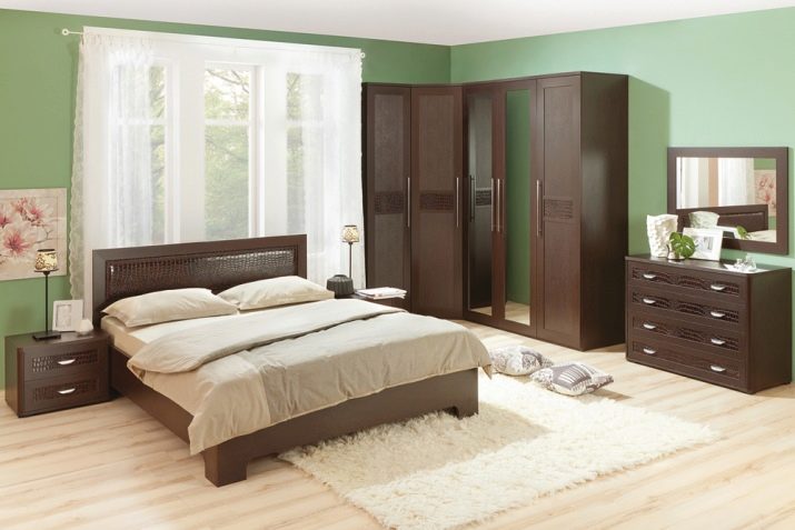 - Low-key dark chocolate bedroom set with clear lines and decorations in the form of leather inserts, it will be interesting to look in a room with pale green walls, a white ceiling and a floor covered with a light cream laminate. Beige fluffy rug on the floor, translucent curtains on the windows and paintings on the walls with images in pastel colors will complete the decor.