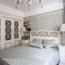 Luxurious royal style in the design of the bedroom. Instead of gilding - silvering, exclusive carving emphasizes the overall style of the decor and is combined with the ornament of wallpaper.