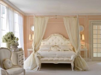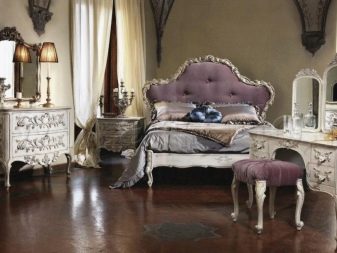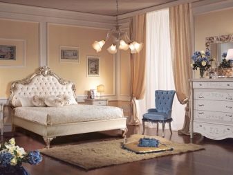 In the Italian bedroom, this style will look incredibly harmonious. Asymmetry, curved outlines, carvings with floral and floral ornaments here are harmoniously combined, for example, with the red-brown color of natural wood. In cabinets stained glass inserts will be appropriate. The bed should have a rounded back with fabric upholstery, bent legs. Armchairs are replaced with elegant goats or pouffes.