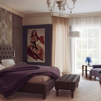 If your bedroom turned out to be slightly gloomy, then correctly selected lighting can correct the situation. But First, lighten the “workload” of the curtains, make them more airy, allowing sunlight to penetrate the entire room. The next step is to choose a ceiling chandelier with several lamps. The design of lamps, chandeliers and sconces depends on the overall design of the room.