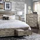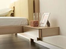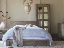 The photo shows a composition where only natural furniture is used. Light wood with an original pattern looks very good. Such items in a bright bedroom are quite logical.