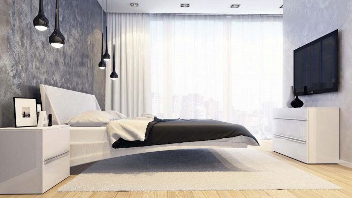 For the bedroom, the bed is the most important piece of furniture. It is located in the center of the room. They try to make the headboard and legs as invisible as possible. Often use a podium to place a berth. Sometimes they use the technique of a soaring bed, they carry out lighting between the floor and the bed. To simplify the interior, bedside tables of the correct form are installed, devoid of any decor on the facades.
