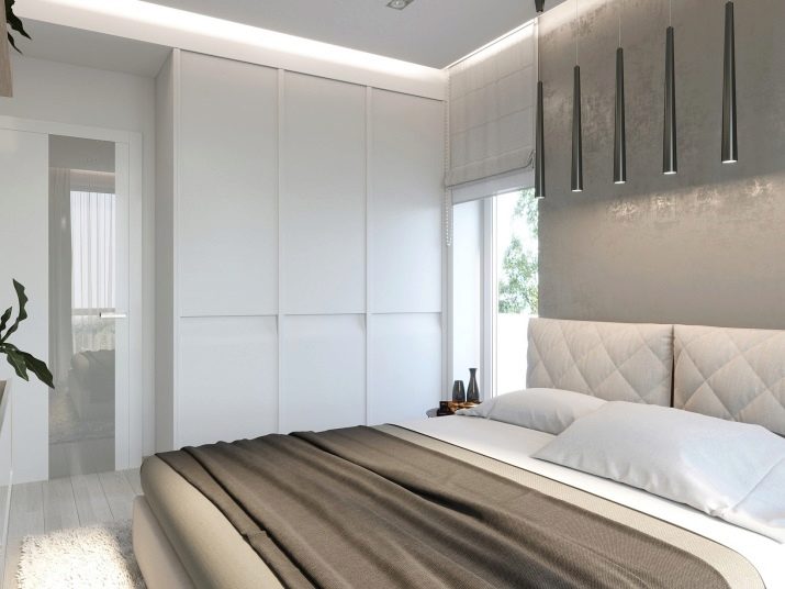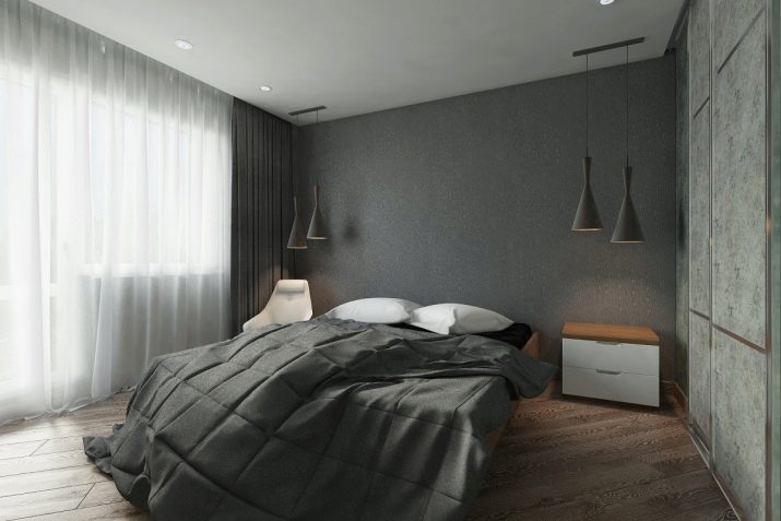 - In the design of the room selected gray monochrome color scheme. The bedroom has a minimum of furniture and a complete lack of decor, even a built-in wardrobe is similar to part of the wall.