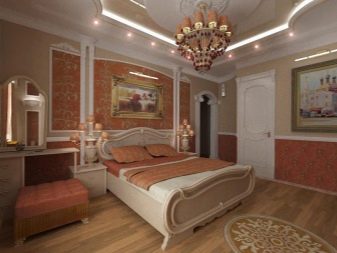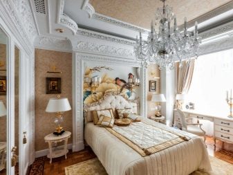 In the bedroom in the style of rocaille or baroque it is better to use a multi-stage design with backlight and repeating decoration elementsplaced according to the rules of symmetry.