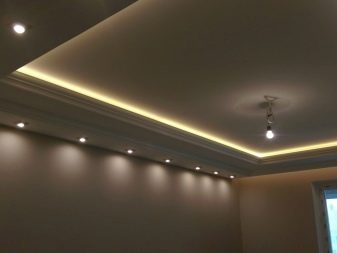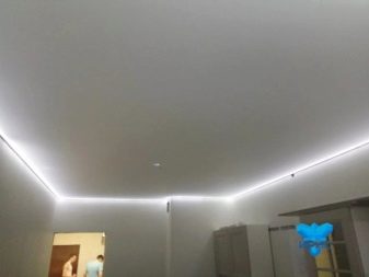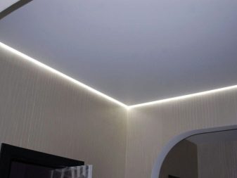 - LED backlight. It is excellent in that it can be guided and bent as your heart desires. Through it, the very soaring ceiling is formed. For this, the diode strip is placed in a specially designed cornice. You do not see the source of light, and it seems that the ceiling itself glows over the entire area. But in fact, you observe only a narrow band of light.