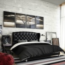 For this concept, a bed with clear forms of the frame, a soft back, possibly turning into a horizontal rack, is suitable. Arches, shelves, chests of drawers and bedside tables should have a plain color and a simple geometric shape (most often rectangular).