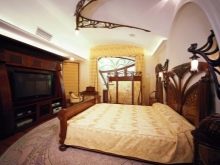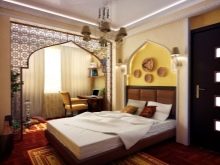 The oriental-style bedroom is characterized by a spacious wide bed with decorative pillows. Above the bed you can see an element such as an arch in the shape of a dome or a mirror. Lighting devices have a rather complex shape, the main light source is a massive chandelier hanging above the bed.