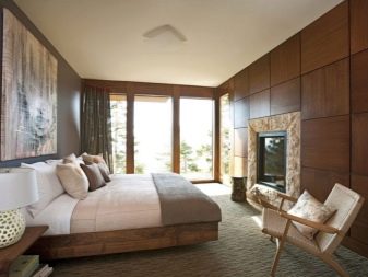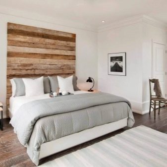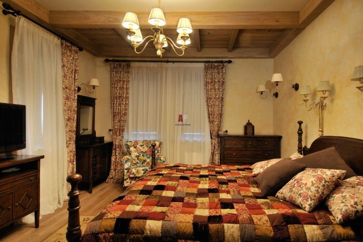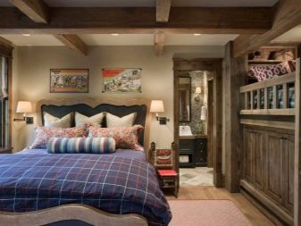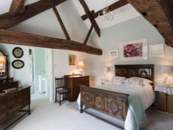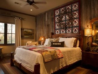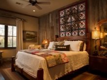 The bed is characterized by a dense wood frame, the rectangular back of which is made quite simply and concisely (without an abundance of thread and complex shapes). If possible, beams should be included in the ceiling of a room designed according to this concept. Of the additional elements of furniture and decor, it will be worthwhile to purchase decorative chests made of wood, small dressing tables and chests of drawers.