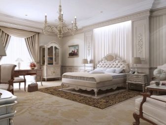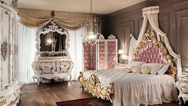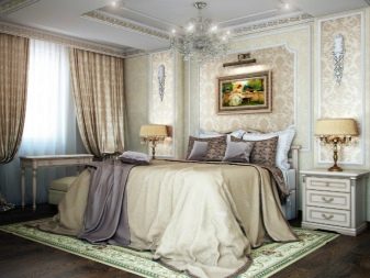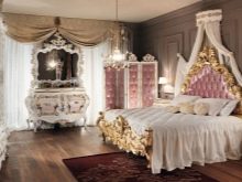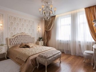 The forms of furniture in such a bedroom are inherently smooth, a massive bed should have a high back with wave-like outlines, as well as legs. In addition to the bed, items such as a chest of drawers and bedside tables should also be present. A mandatory attribute of such an interior is a large chandelier with a suspended structure in the center of the ceiling. Massive curtains featured from textiles, consisting most often of two types of fabrics, decorative pillows on the bed and carpet. As accessories, framed paintings and stucco details can be used.