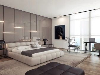 It is worth remembering the abundance of light in such a bedchamber. It is preferable that the room had large windows, but do not forget about the exquisite floor lamps and sconces. In addition to the main furniture, the bedroom may also have one or a couple of simple design chairs that match the tone of the rest of the furniture. The walls can be supplemented with open shelves and minimalist paintings, and the floor with a small carpet will to the bed, which can include a simple ornament.