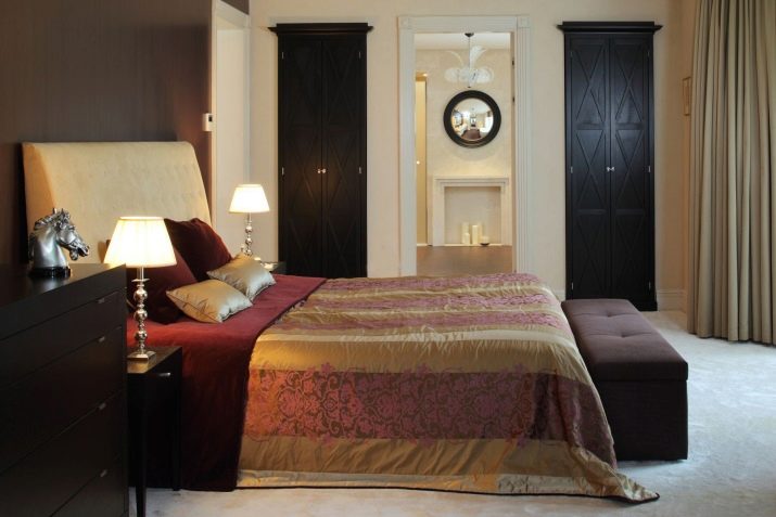 As a floor covering can be used wood material. The bedroom will look perfect parquet. Figurines, wooden and glass vases, and also forged accessories can be used as decor elements. In addition, the decorative role can be assigned to the original lamps.