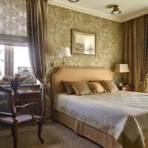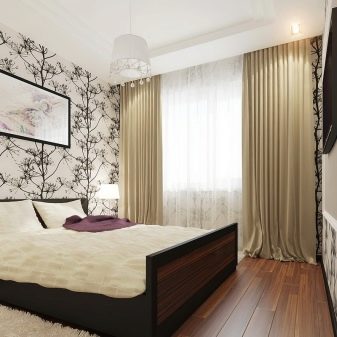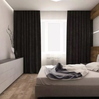 If you prefer functionality even in design elements, then minimalism is a worthy choice. Here, Roman or Japanese curtains, curtains on hinges, with various lapels are appropriate. There are also stringent requirements for accessories - there shouldn’t be a lot of them, and they shouldn’t “get out” of style. The room does not need a lot of furniture. A room not cluttered with things allows you to fully relax and guarantees a deep sleep. Regarding colors - it is better to use plain drapes that blend perfectly with each other. Contrast symmetrical pattern or the presence of a bright strip at the top of the curtains are permissible.