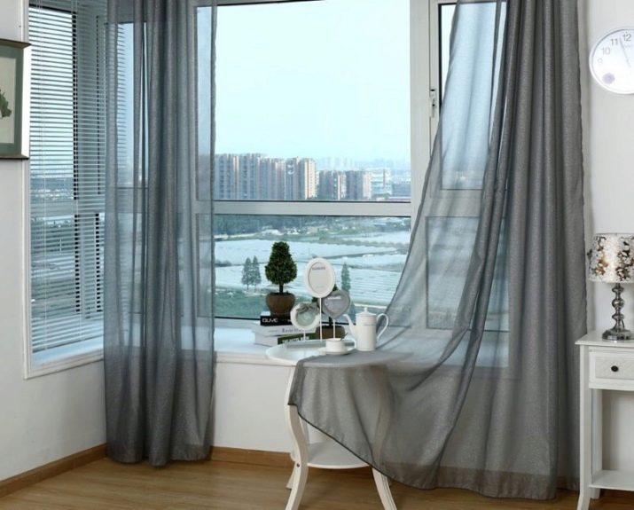 - Organza. Transparent fabric with a rigid structure, shimmers in the light. If you add gray organza curtains to the interior, they will resemble a silver shade or metallic.