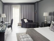 - Grey. This common color, despite the nobility, may look too boring and restrained. Therefore, the goal of textiles is to revitalize the environment. Curtains with blue, pink, green, violet are well suited.Do not try to look for gloomy shades: they will give the room dullness, uncomfortability.