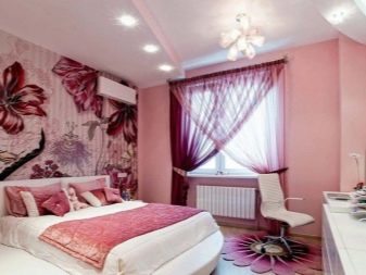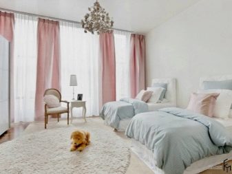 - Pink. It’s best not to contradict the overall dreamy-romantic mood created by the pink walls. Light textures, translucent fabrics of yellow, gold, blue, lavender, pale red shades are perfect.