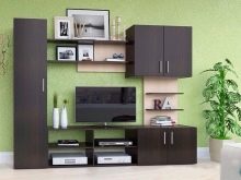 Most often, the finished module includes the wall itself, hinged shelves, racks or cabinets, including a wardrobe. Corner modules provide a large corner cabinet in which large things can be conveniently placed, possibly a design with a chest of drawers, for example, under a TV niche.