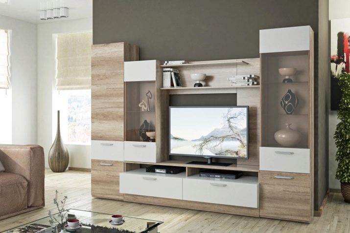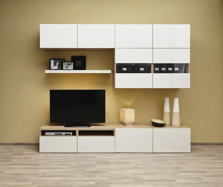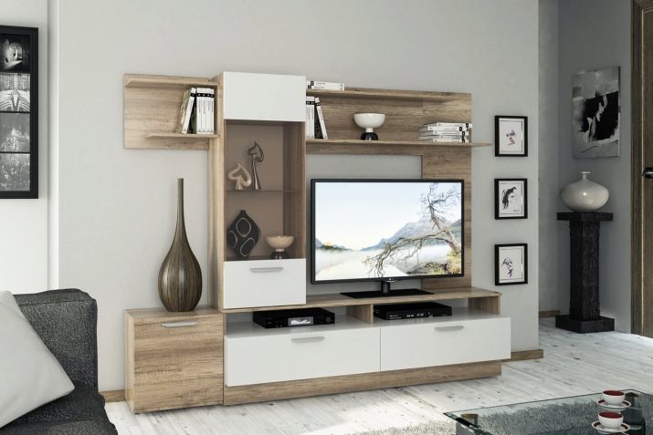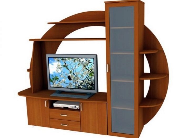 - The most common model is "under the TV." Its central part is a niche for an LCD or plasma TV, you can also install an audio system there - including speakers, there are shelves and drawers to accommodate various things. Most of the wall is occupied by shelves.