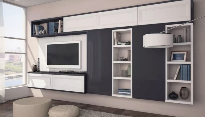 Suspension walls can be assembled from several elements. It can be roomy and attractive cabinets with pedestals, hanging shelves. Regardless of the specific modification, such walls look weightless, light and beautiful, do not burden the interior. Using these structures, you can visually expand the space.