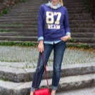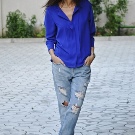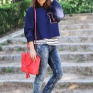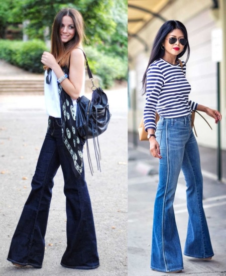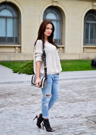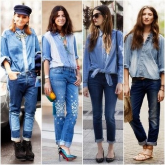 Denim trousers go well with a variety of t-shirts, shirts, blouses, cardigans, and other casual wear. Bright, large accessories are suitable for such an image.