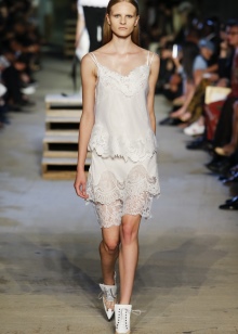 Looking at the latest fashion shows of famous designers, you can highlight another trend in the lingerie direction in clothes. To include this style in your image, it is enough to demonstrate one of the elements of underwear with carelessly and unobtrusively. A beautiful bra that looks out from under a T-shirt or top will look sexy and stylish. The elastic from panties can also, as if by accident, remain naked jeans or trousers. The most popular way to apply this type of underwear style is to wear a shorter skirt or dress on top of the lower skirt with a lace edge that is visible.