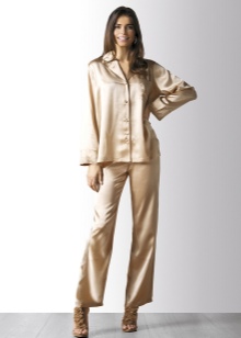 A light silk pajama style suit is perfect for evening promenades in the warm season. The free cut of such clothes allows you to pick up flats, moccasins or flat sandals to the suit. Deep dark shades or the presence of floral or other prints are welcome for pajama sets.